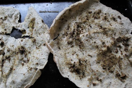 4. Bake it at 350F for 3-4 minutes. Make sure to check as these chips are very thin and can get brown very quickly. When slightly brown and crispy, remove from oven and let it cool down. If you are not separating pita layers then bake little more (5-7 mins) until crisp.