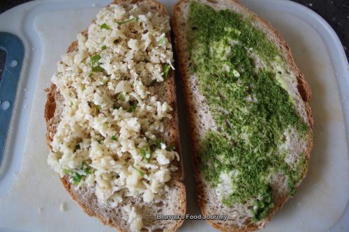 3. When you are ready to make sandwich, take 2 slices of bread. Spread butter on both. Spread chutney on one slide and cauliflower paneer mixture on another. Sprinkle little jiralu powder on top. You can add some grated cheese if you like. Flip slice with chutney and top it on other slice.