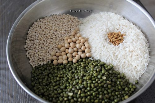 1. Wash and soak rice, moong, urad, soya beans and fenugreek seeds in water for 7-8 hours, it will almost double in size.