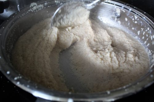 4. Gradually add sugar and water/milk mixture in sooji. Add liquid with one hand and stirring sooji with another. You can take help of someone at this point who can pour hot liquid and you can stir. The mixture will start bubbling so be very careful when you add boiling liquid to the mixture. Cook on low and continue to stir. When all liquid evaporates, and halwa starts leaving the pan, then it is ready. Turn off the heat. This step may take 2-3 minutes.