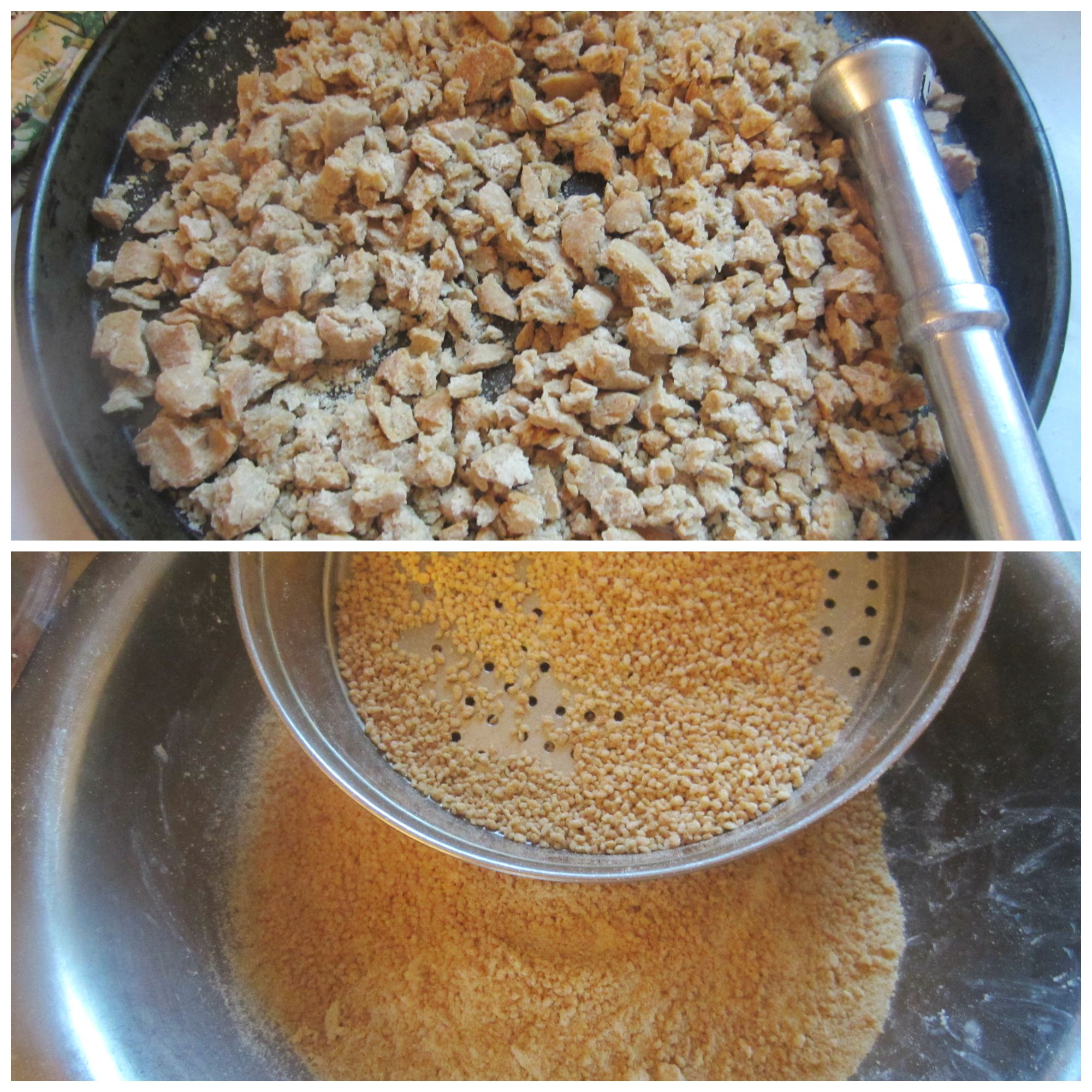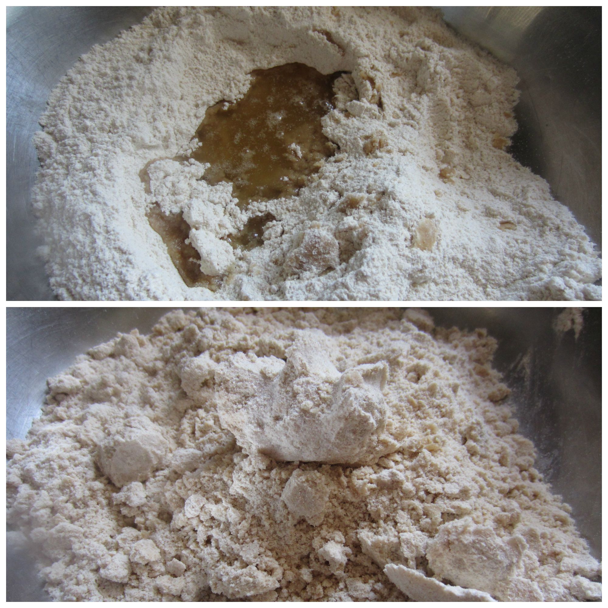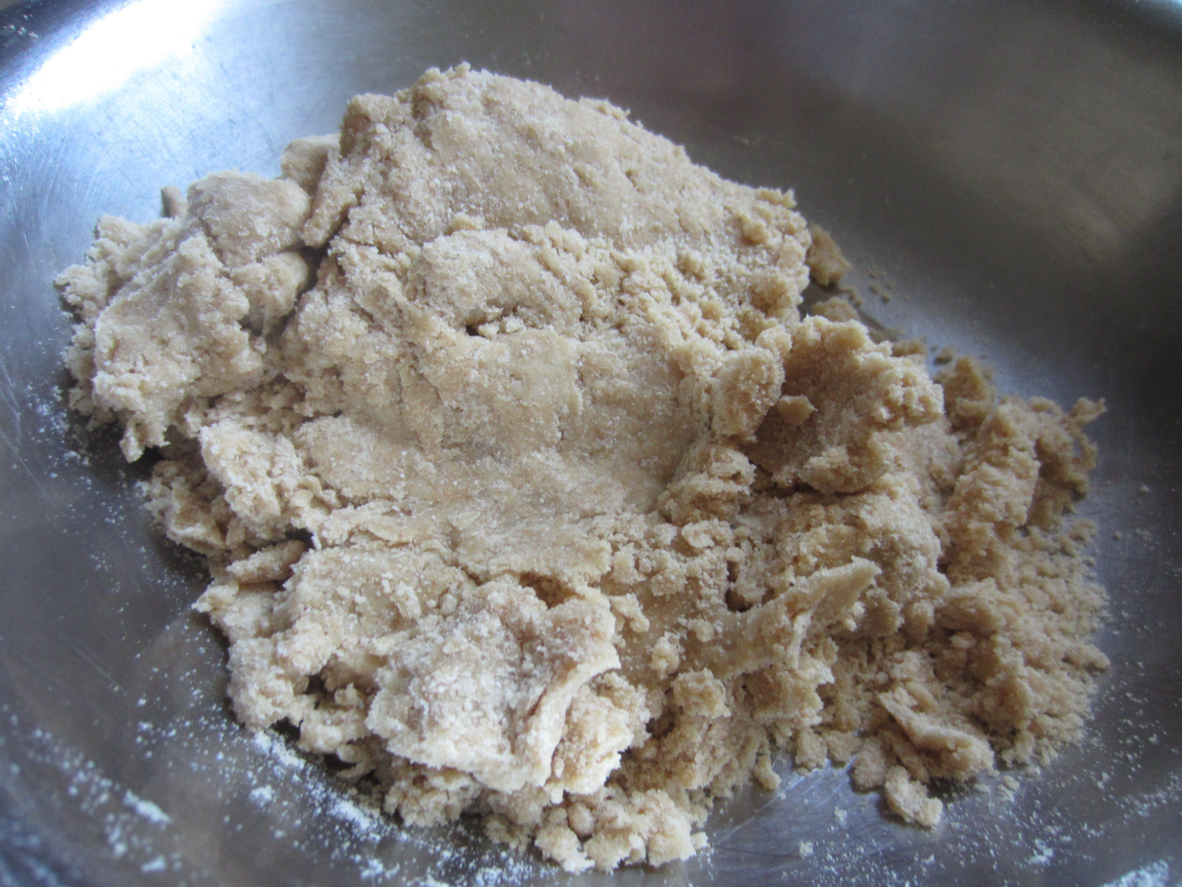 3. Make a crumbly dough by adding tablespoon of warm water at a time. You will need around a cup of water to make the dough which can bind together but still very hard.