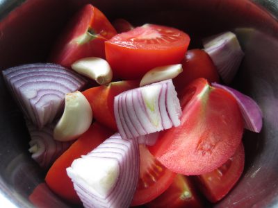1. Cut big chunks of tomato, onion, garlic cloves (without skin) and potato in a pot, add some water and pressure cook for 2 whistle. Boiling onion and garlic helps to get rid of raw smell.