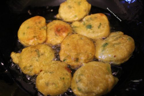 2. When you are ready to make pakoda, heat a wide bottom cast Iron frying pan. Add about 2 inch oil and heat.