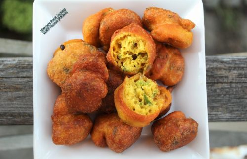 5. You can also make these in appe pan (without frying). Add a drop of oil to each hole of the Paniyaram (appe) pan to grease it. Pre-heat the pan on medium heat on the stove. Once the pan is hot, whisk the batter once again, then pour the mixture into each hole and let it cook for few minutes until lower side is done. Then flip each ball over upside down, add another drop of oil to each hole, and cook it for another 2-3 mins, until the whole pakoda is golden and crisp.