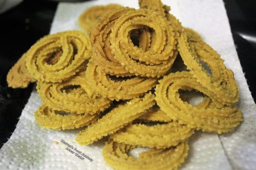 6. When oil is hot, reduce the heat to medium. Drop in one chakri at a time using flat spatula. Do not over crowd the pan. Fry chakri on low to medium till it’s golden brown from both sides. Prepare one batch at a time. Chakris are very delicate, be very gentle while frying in the start. Let it get slight hard in frying pan before moving. You can fry 8-10 chakri at a time depending on the size of your frying pan. When ready, remove on paper towel. Then fry the second batch. I try to keep 10-12 spiral ready while I am frying one batch, so second batch is ready for frying.