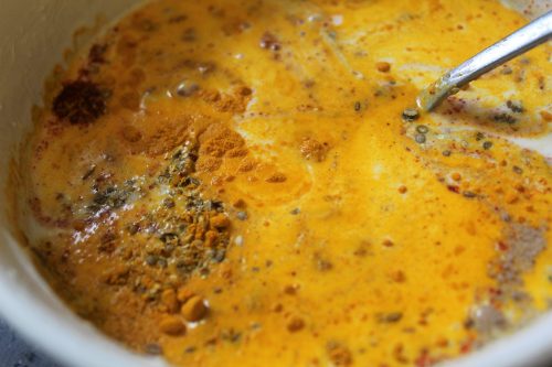 3. In the same pan, add 1 tbsp oil and cumin seeds. Keep the heat on medium. Once cumin seeds start to change colour, lower the heat and add yogurt mixture. As soon as you add yogurt to hot pan, whisk rigorously for 2-3 minutes otherwise yogurt will start to curdle.
