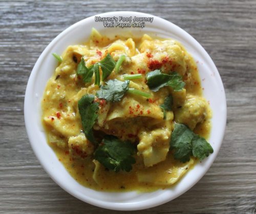 My all time favourite sabji. This sabji is very easy to prepare using ingredients from the pantry. Whenever I am out of fresh veggies, this is something I love to cook. It’s cooked in literally 10-15 minutes. I make chola (lobia) vadi during summer and store it for whole year. It is also available in Indian store. Then I use it to prepared baingan vadi sabji, papad vadi sabji, etc. It’s very traditional Indian food prepared in many regions especially in Gujarati and Marwadi cuisine. Jain people uses it during their holly month when fresh veggies are not allowed.