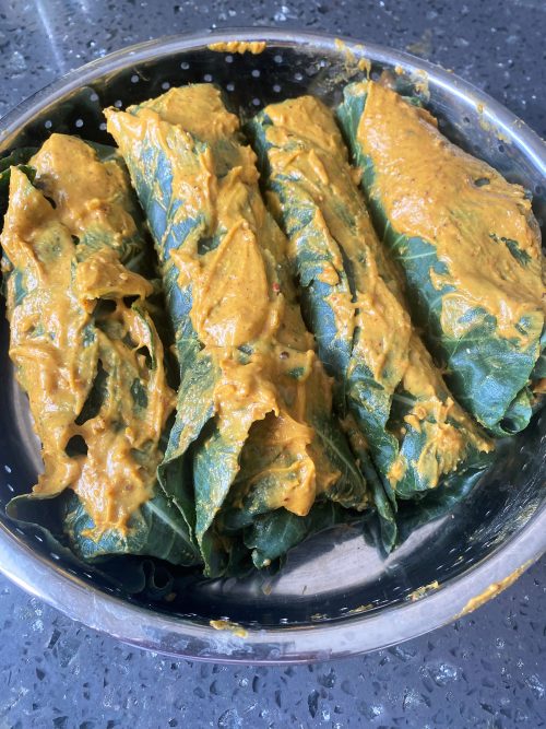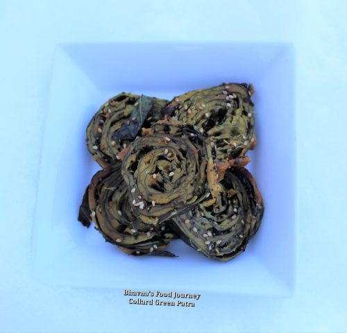 Patra or pattarveliya is a very famous Gujarati snacks. This is known as aloo vadi in Maharashtra, Patrode or Pathrode in Himachal. It has a blend of sweet, sour and spicy taste. Traditionally it is prepared using colocasia leaves (arbi patta) and besan. They are steamed first and then shallow fry. I love patra but here in Canada it is hard to find arbi patta in Indian grocery store. I tried making spinach patra they turned out perfect. But compare to arbi leaves, spinach leaves are much smaller so it takes time to arrange it. So when I notice collard green at my regular Canadian grocery store, they looked exactly like colocasia leaves. I even tested a small piece and there was no specific taste so I decided to use it to make patra. I found making patra with collard green was so much easier and quicker. I bought 2 bunch (15-16 leaves) and it was enough to make 4 rolls. They turned out really delicious 😋. If you don’t tell someone that you are using collard green instead of arbi leaves (keep this a secret 😉), they will not feel the difference in taste. It was great success and I will be making it again and again.