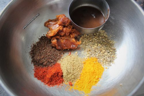 4. In a bowl, first add turmeric powder, coriander powder, chili powder, crushed coriander, masala blend (you prepare earlier), jaggery and tamarind pulp.