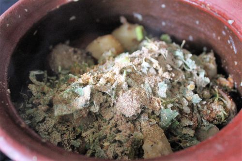 3. In a clay pot, add 2 tbsp oil. Also add ajwain, sesame seeds and chopped garlic. Now put clay pot on stove and turn on the stove. Always keep the heat to medium when you are cooking in clay pot. In a minute or so, oil will be hot and ajwain will change the colour.