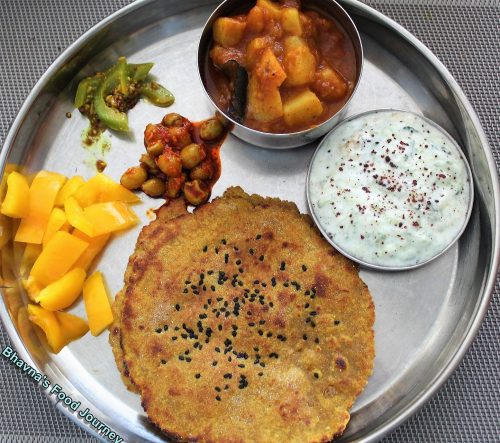 This is methi masala roti, we call it methi na thepla is preppared almost every week in our house. I make it slightly different depending on what veggies I have at home. I add methi (fenugreek leaves), zucchini, carrot, bottle guard (long squash). I also add sesame seeds, ajwain depending on the mood. Sometime I also add yogurt to give slight tangy taste. This is easy to store and freeze. If I am in a mood and have some time on hand, I will prepare 20-25 thepla and freeze them in ziplock bag. When we want to eat it, I either put it on hot tawa for few seconds or microwave it and serve it with chai. In India, this is served mostly during dinner and leftovers are served during breakfast. It goes well with curried potato sabji, fresh home made yogurt, raita, Indian pickle etc. for dinner or with masala chai for breakfast. We also like to spread some ghee or butter on cold thepla before eating. We Gujarati are famous for carry thepla during traveling. We also make these for new mom for her snacks adding lots of fenugreek leaves. Kids love it with jaggery. These are easy to travel with and can last longer if done right (tip in #2.)