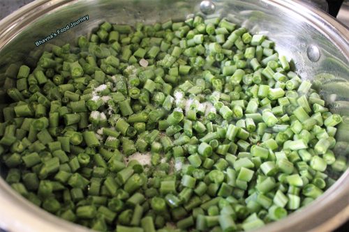 2. Heat pan with 1½ tbsp oil. When oil is hot, reduce the heat to medium and add mustard seeds and cumin seeds. Once seeds start to splutter, add asafoetida and chopped beans. (tip: add 1/2 tsp sugar in the pan so green beans will stay green and it will not change colour). Also add salt. Mix everything well and cook for 2-3 minutes stirring frequently.