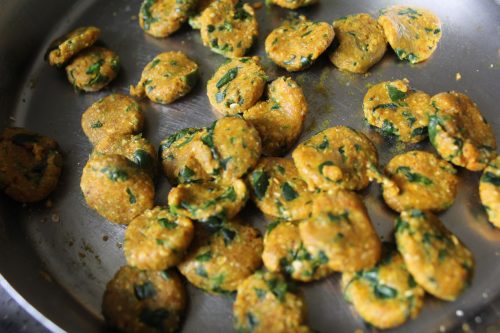 1. Mix all dhokli ingredients in a bowl. Add very little water at a time and make hard/tight dough. Now make small coin size dhokli. Keep it on a side.