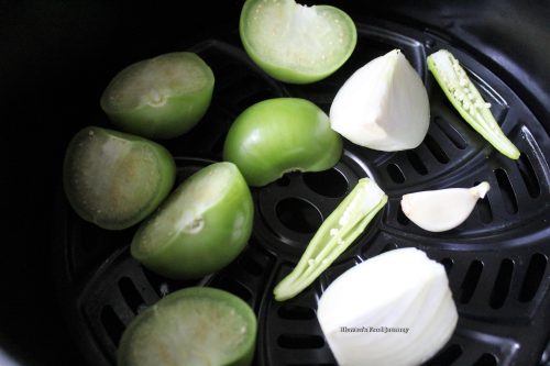 1. Cut tomatillo in half, cut onion in quarters, jalapeno in half. Arrange everything including garlic gloves in air fryer tray or oven tray. Roast this at 350F for 4-5 mins in air fryer or 7-8 mins in oven. Just keep eye on and don’t let it burn.