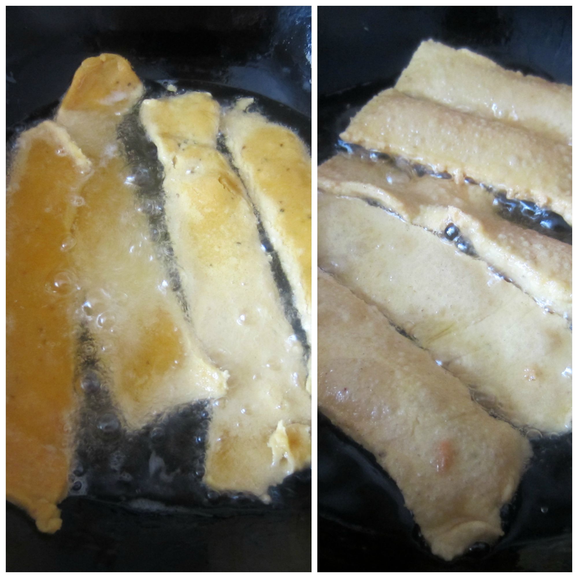 8. Carefully pick up one piece at a time and drop in hot oil. Fry 4 to 5 pieces at a time on medium heat. Fry till both the sides are slightly golden and cooked properly.