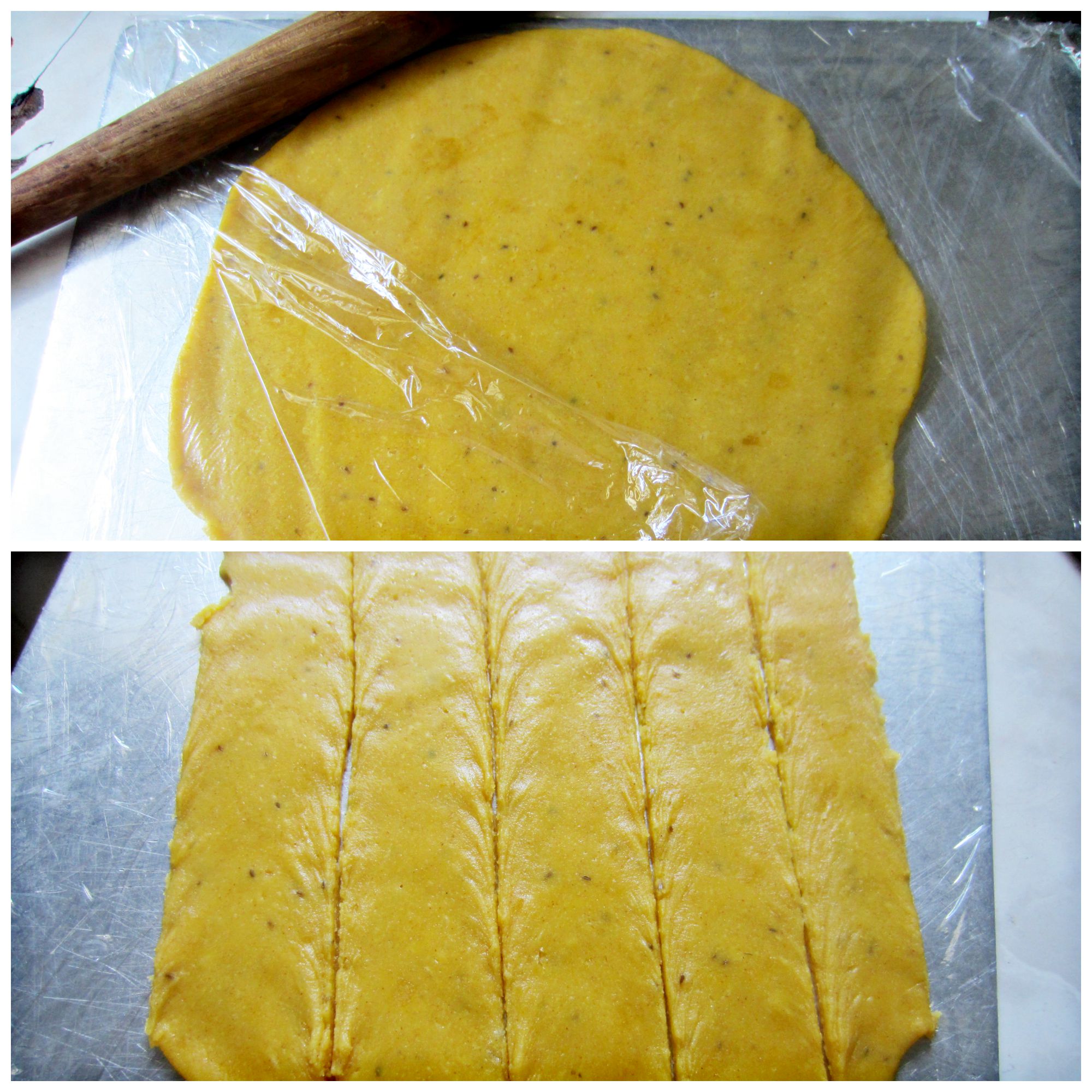 7. If you can’t make a thin strip stretching with your palm, then cover the flat surface with plastic wrap. Grease the surface with oil. Put dough ball. Cover with another plastic and roll will rolling pin. You can even make bigger round and cut in to strips.