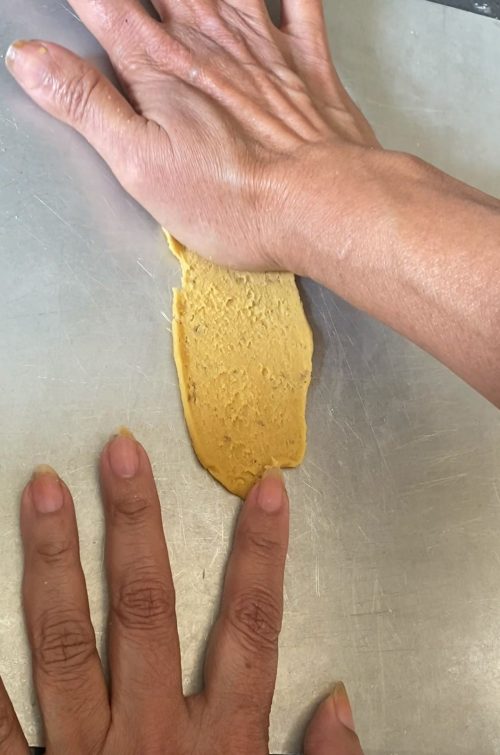 6. Make a small oval shape ball from the dough. Using the wooden flat surface, make a long thin strip using left side of the palm. Then using flat knife scrap the strip in one go. This technique is slightly tricky but if you practice it, it will come out better than last time. Check the video on the top.