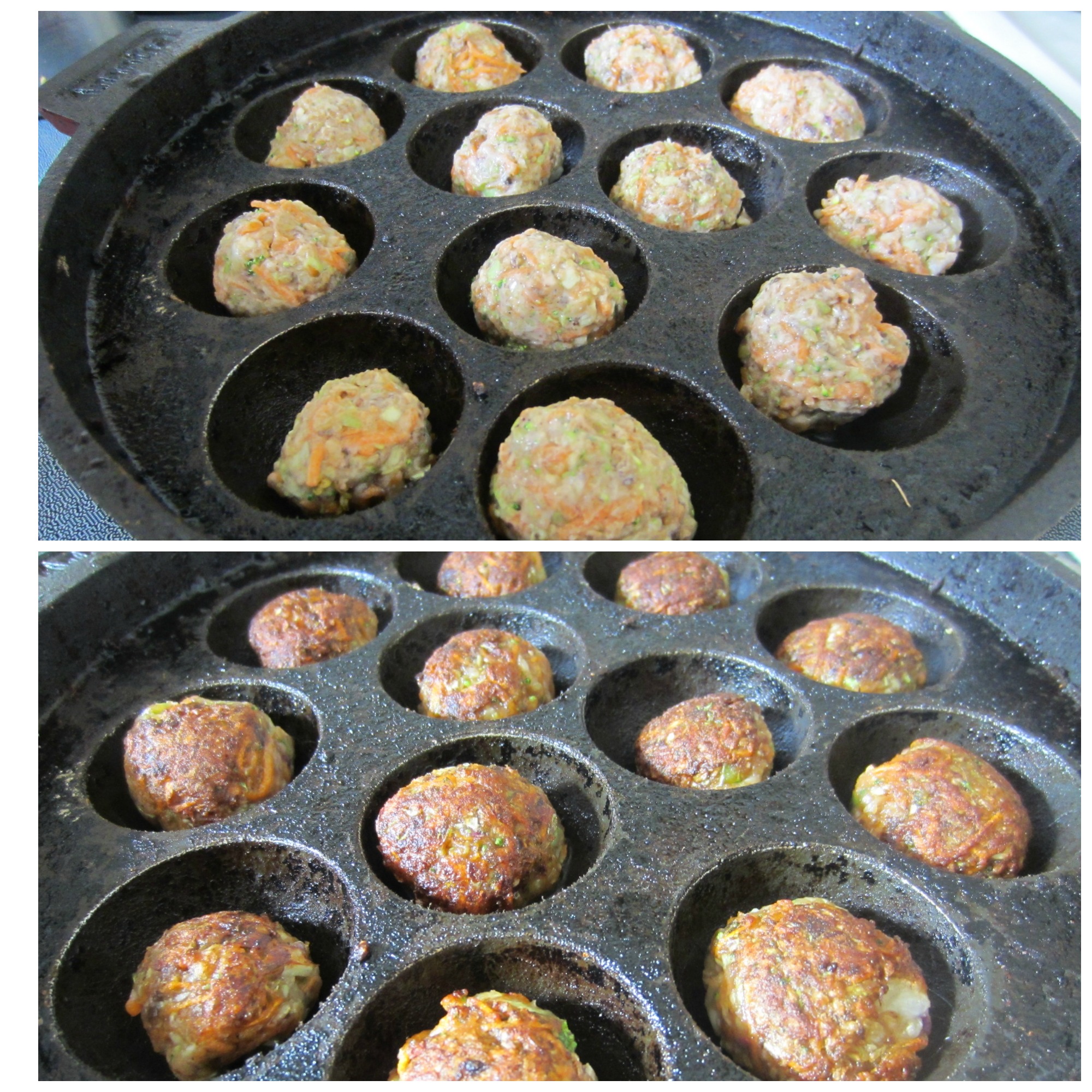 2.1 Cook these balls in paniyaram pan with 2-3 drops of oil on low to medium heat until balls are golden brown from all the sides. It takes around 7-8 minutes to cook one batch.