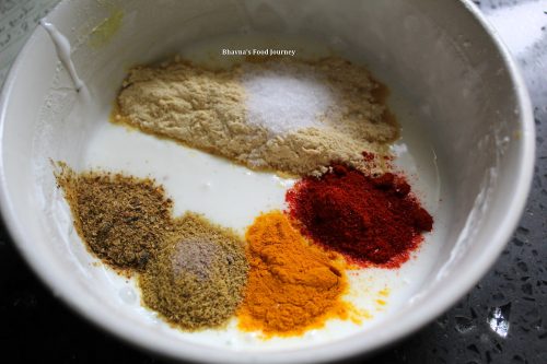 2. In a bowl, combined yogurt, roasted besan, turmeric powder, coriander powder, red chili powder, asafetida, garam masala and salt. Add 1/2 cup water and mix well and keep it aside.